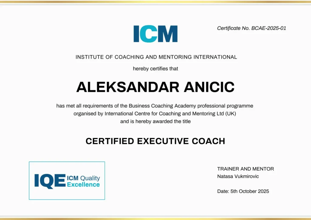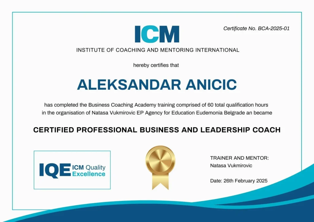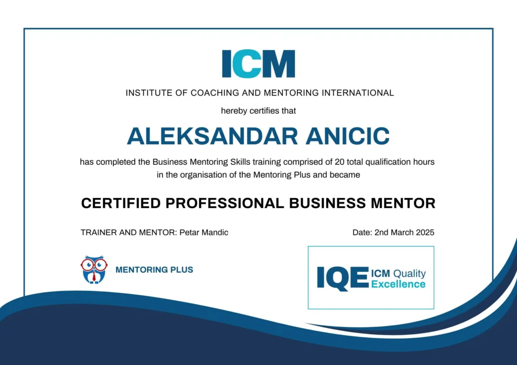 Sertifikaciju sam stekao kroz program “Međunarodnog Instituta za coaching i mentorstvo” — i stalno ulažem u svoje znanje i vještine